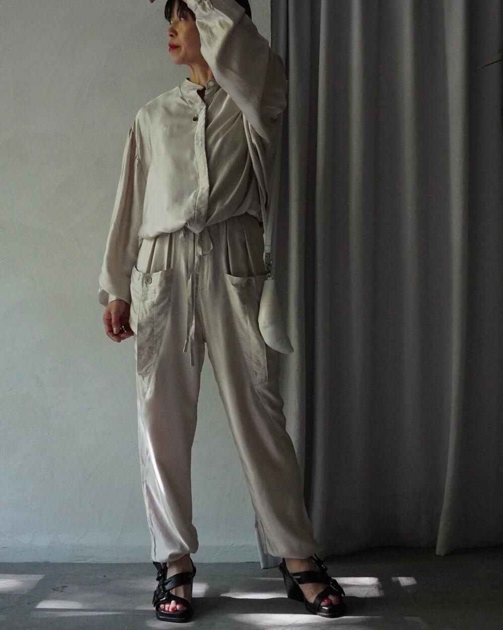 ブラウスはトップスとしても、また羽織としても、ブラウジングすることによって長さやフォルムを変化できる裾のドローストリングがポイント。