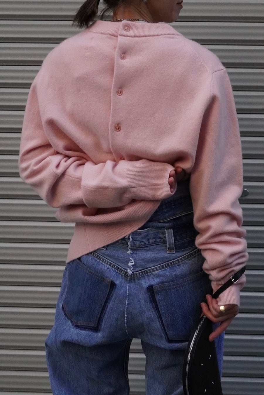 「No.283 ビー ゲーム」カーディガン。柔らかなカシミアブレンドを使用し、前面と背面にボタンを配した一着です。