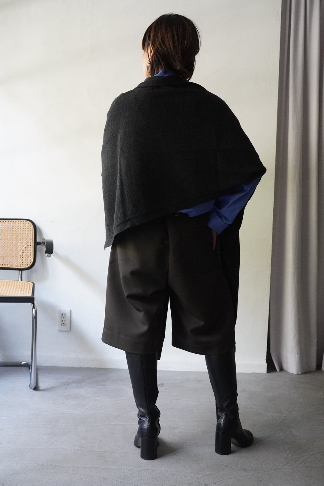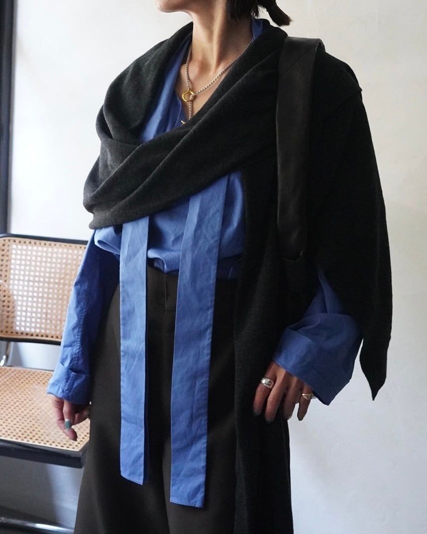 このスカーフは、表面がわずかにメランジ状の、柔らかく中厚手のラムウール混紡で作られています。ショールとして非対称に着用したり、肩に掛けたり、スカーフとして首に巻いたりできます。端を結ぶことができ、セーターの袖を胸元で結んだように見えます。