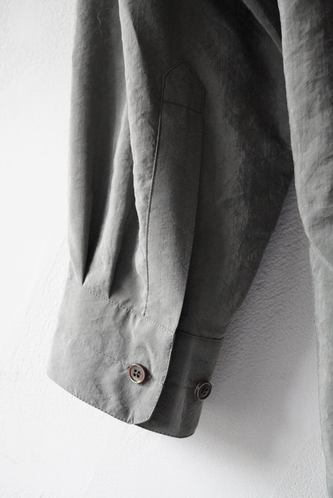 ドライシルクで作られており、柔らかな手触りと強壮な質感を持つクラシックなルメール生地です。そのディテールには、ストレートな襟とヒップまで閉まり、ウエストから膝のすぐ下まで体を包み込む非対称のボタン前立てが含まれます。