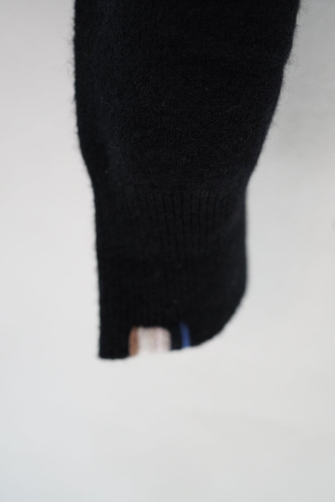 ネックと袖口はリブ編みで、裾はロールエッジで仕上げられています。