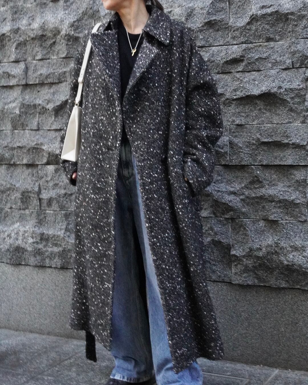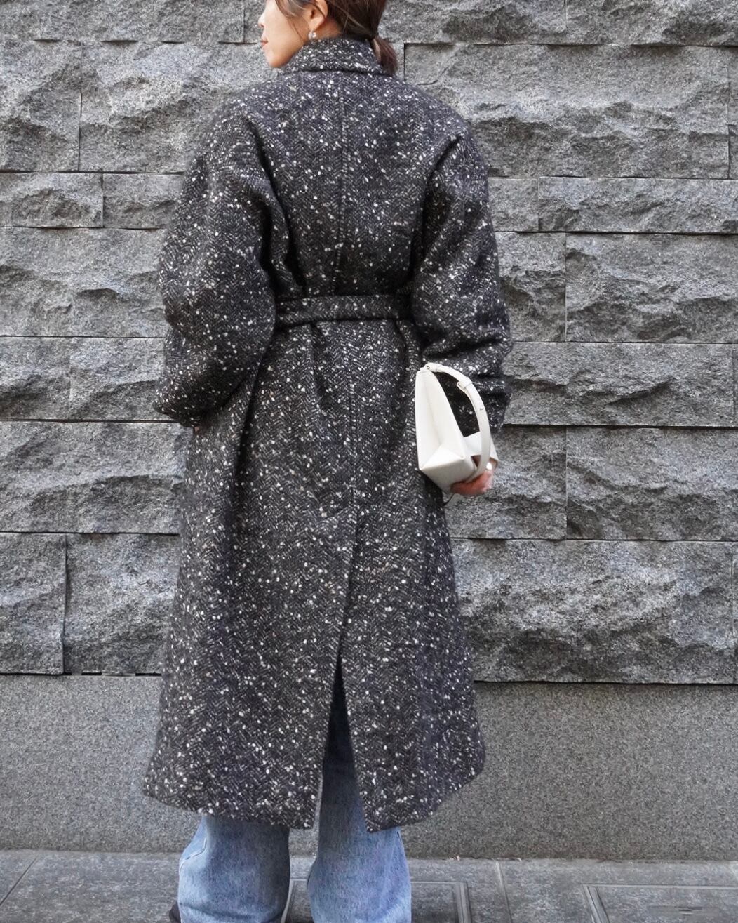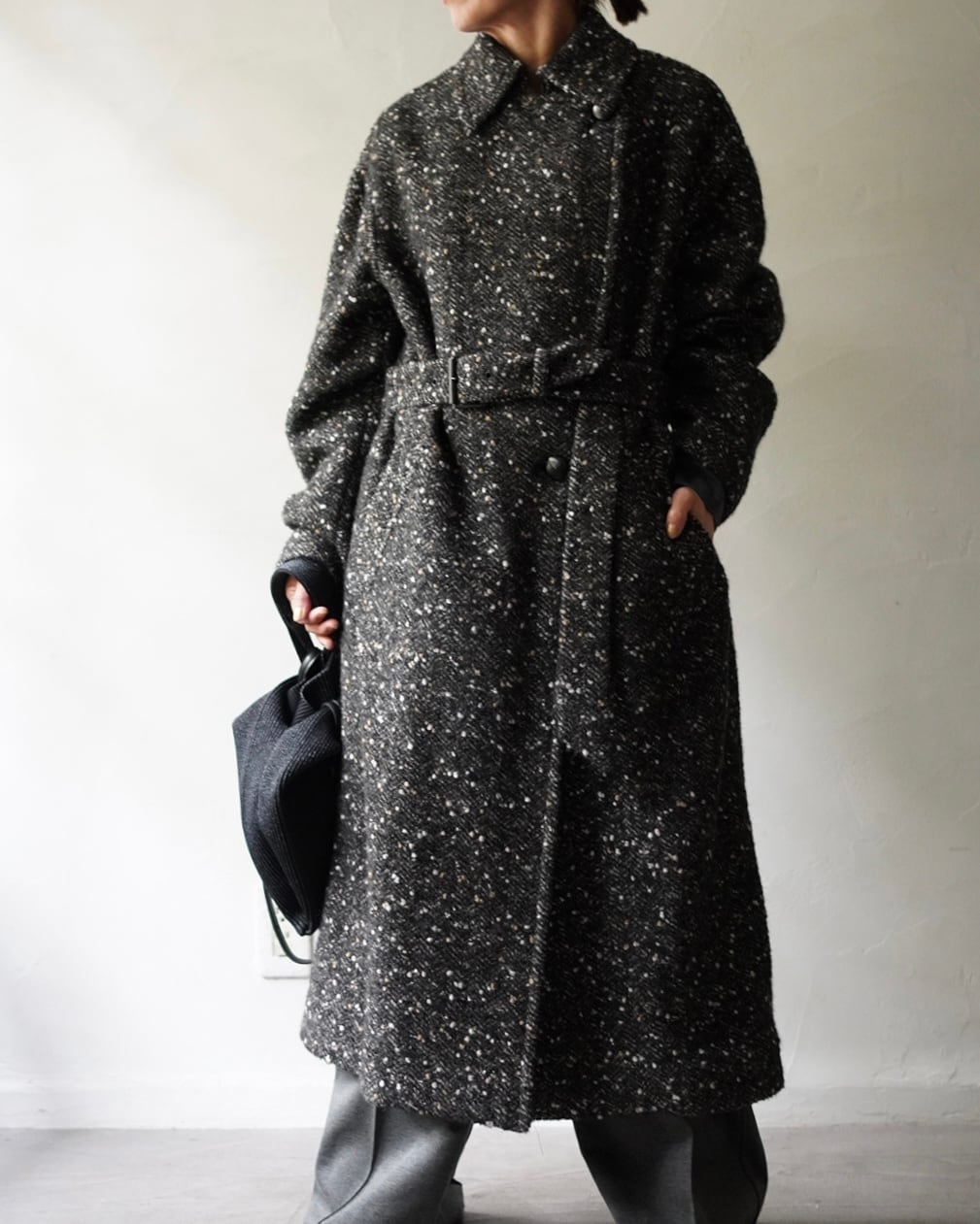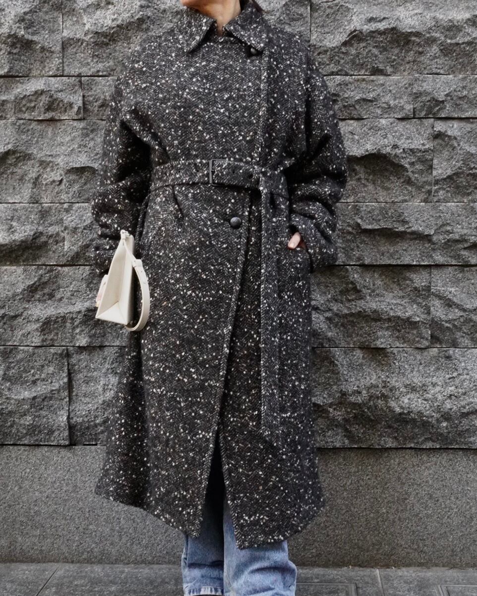 ベルト付きのルーズフィットな混合ヘザウールのロングコートです。