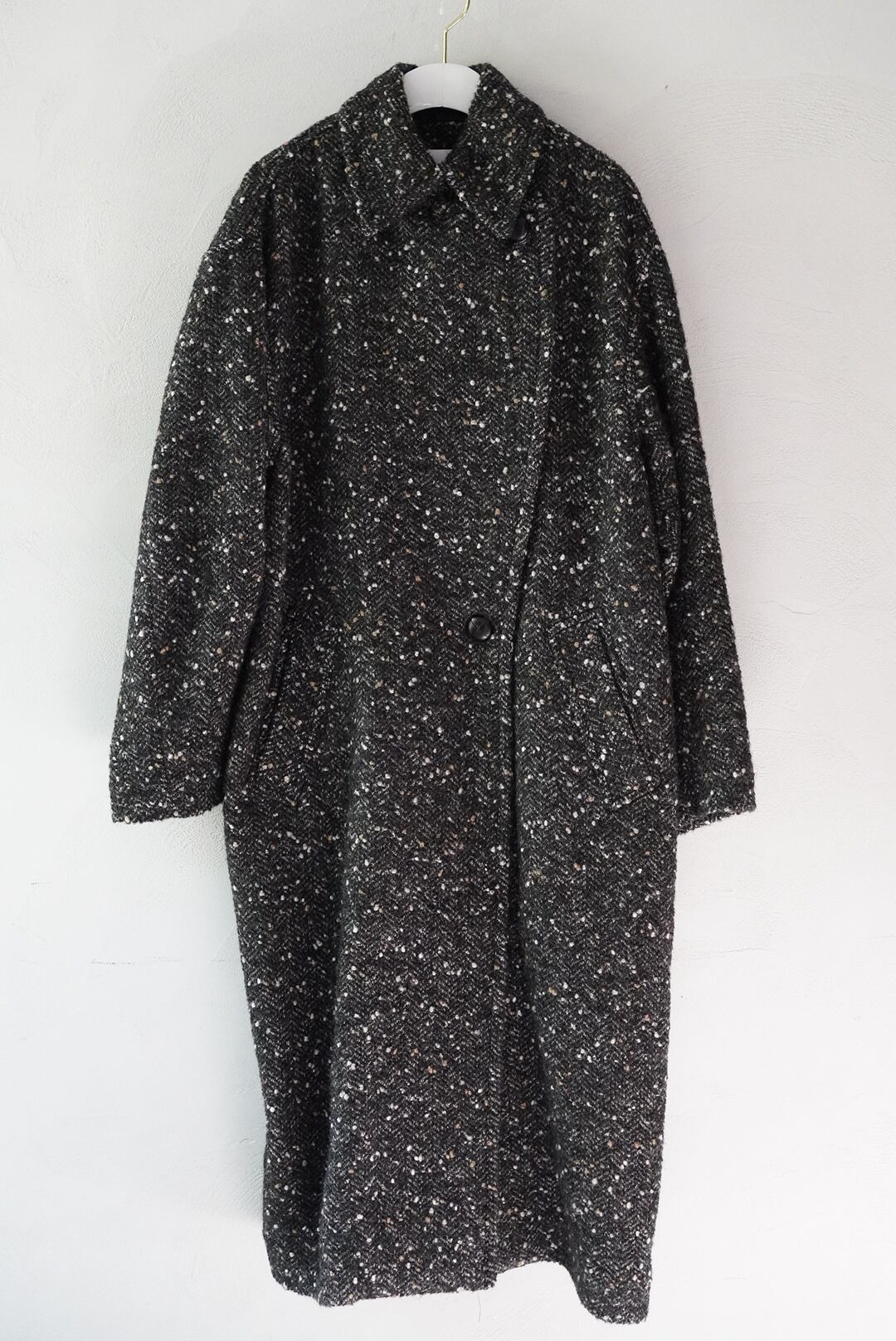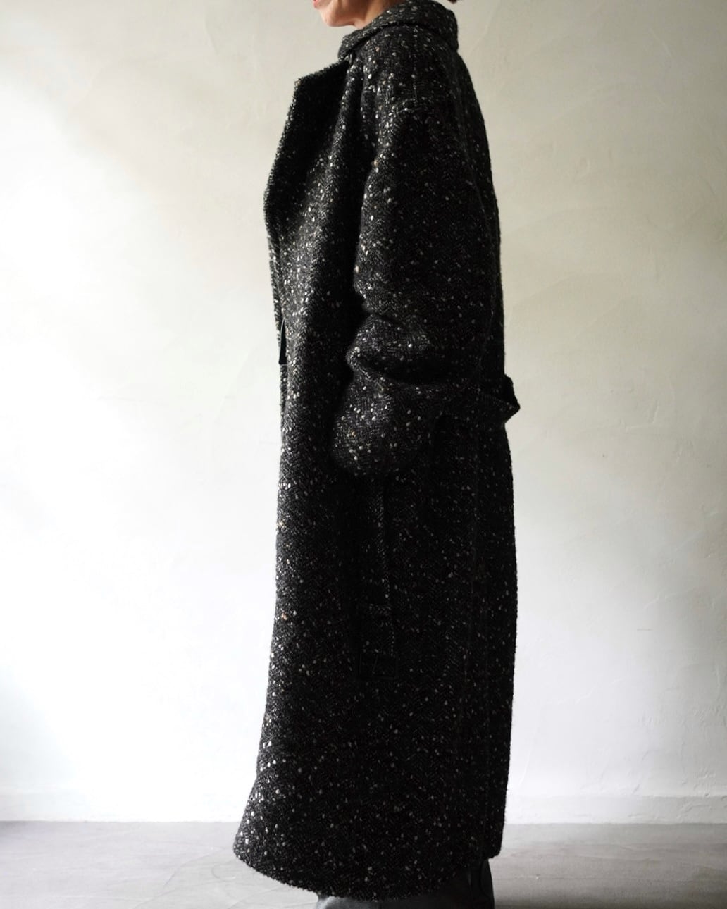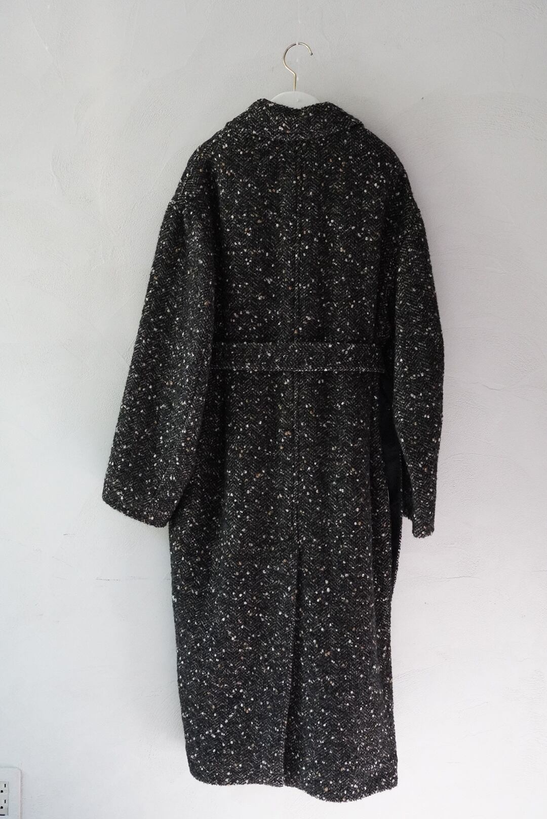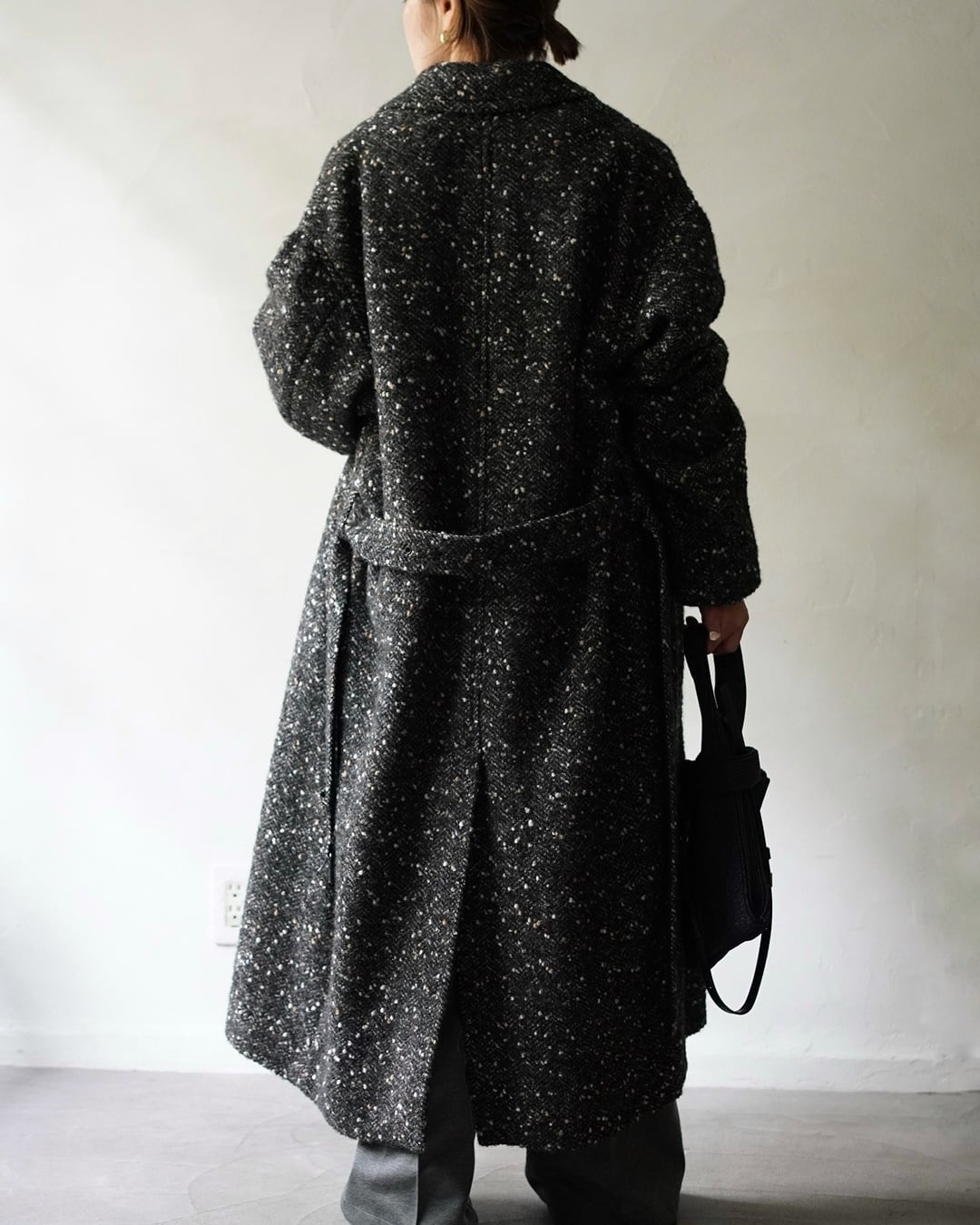 ベルト付きのルーズフィットな混合ヘザウールのロングコートです。