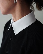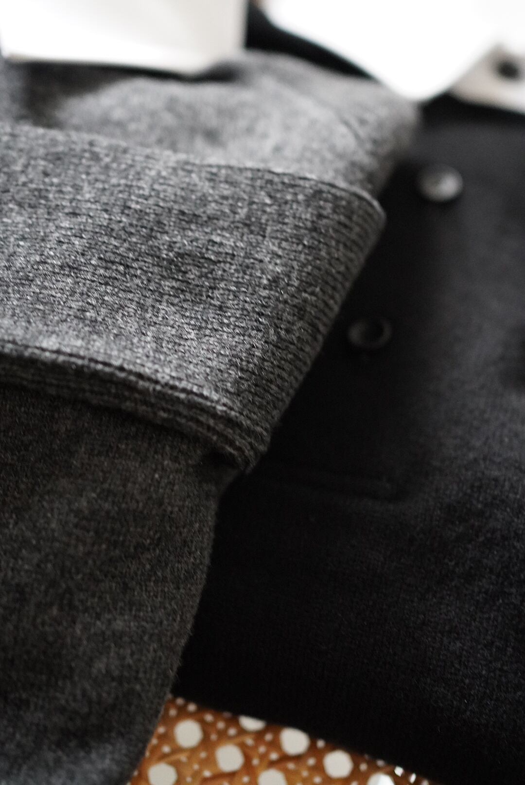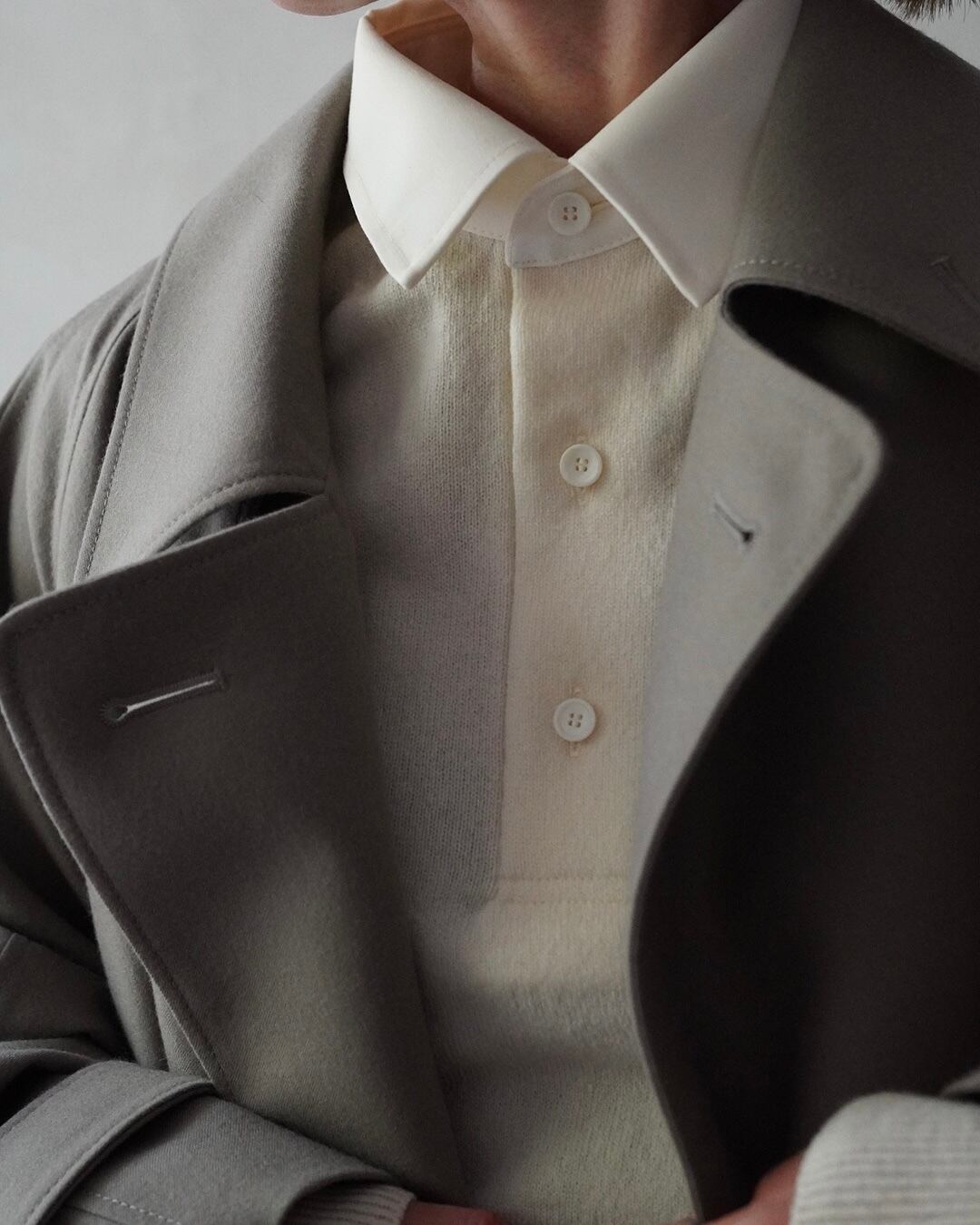 カシミヤ/ウールのブレンド糸を使用した、クレリックポロニットです。衿と身頃の異配色、異素材の切り替えが特徴です。身頃はベーシックな天竺編みで、高密度で編み上げているため形状保形に優れています。袖は細やかな1×1リブ仕様になっているため、よれに強く、安定した着用感を保つことができます。ラグランスリーブにすることで肩線のハリ出しをなくし、肩回りのシルエットが綺麗に出るよう設計しております。袖丈は長めの設計で、袖口は編み出しのミニマルな仕様。折り返しての着用も可能です。体にフィットするタイトシルエットでレイヤードしやすい寸法設定となっている為、スタイリングに取り入れやすい汎用性の高い一枚です。
