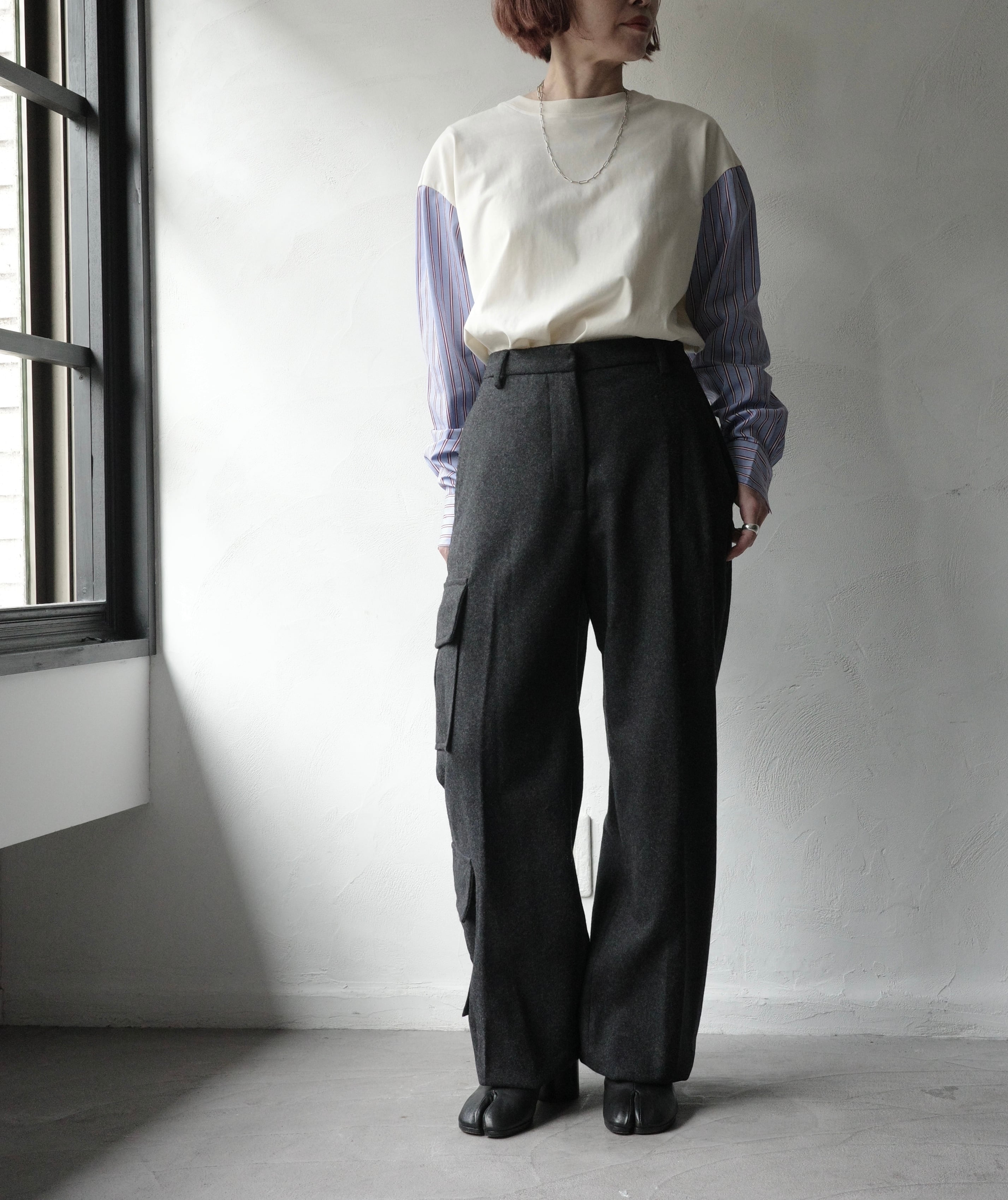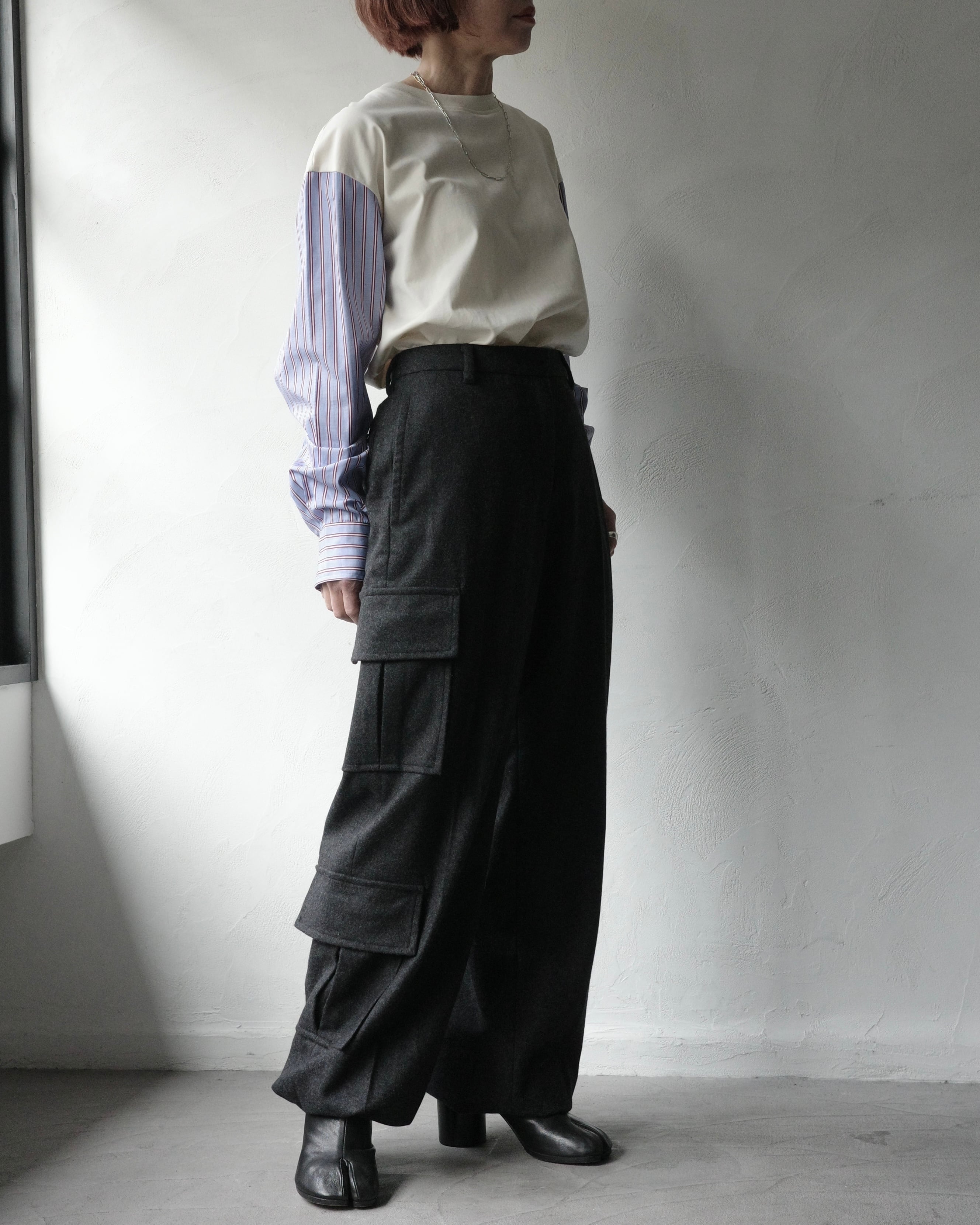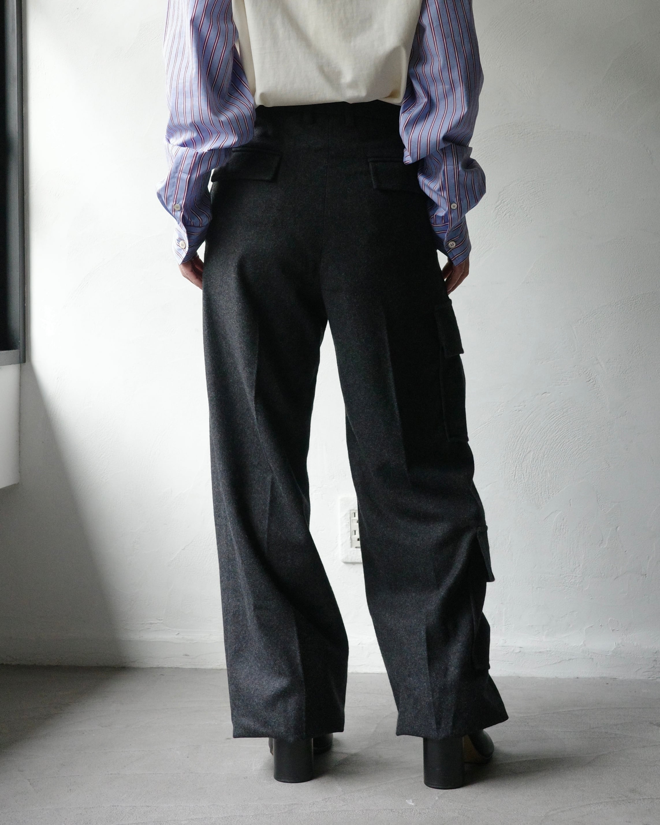 上質なウールとカシミアのテーラリング生地を洗練されたカーゴパンツのシルエットに仕上げました。裾のドローコードで調節でき、さまざまなスタイルに着こなせます。