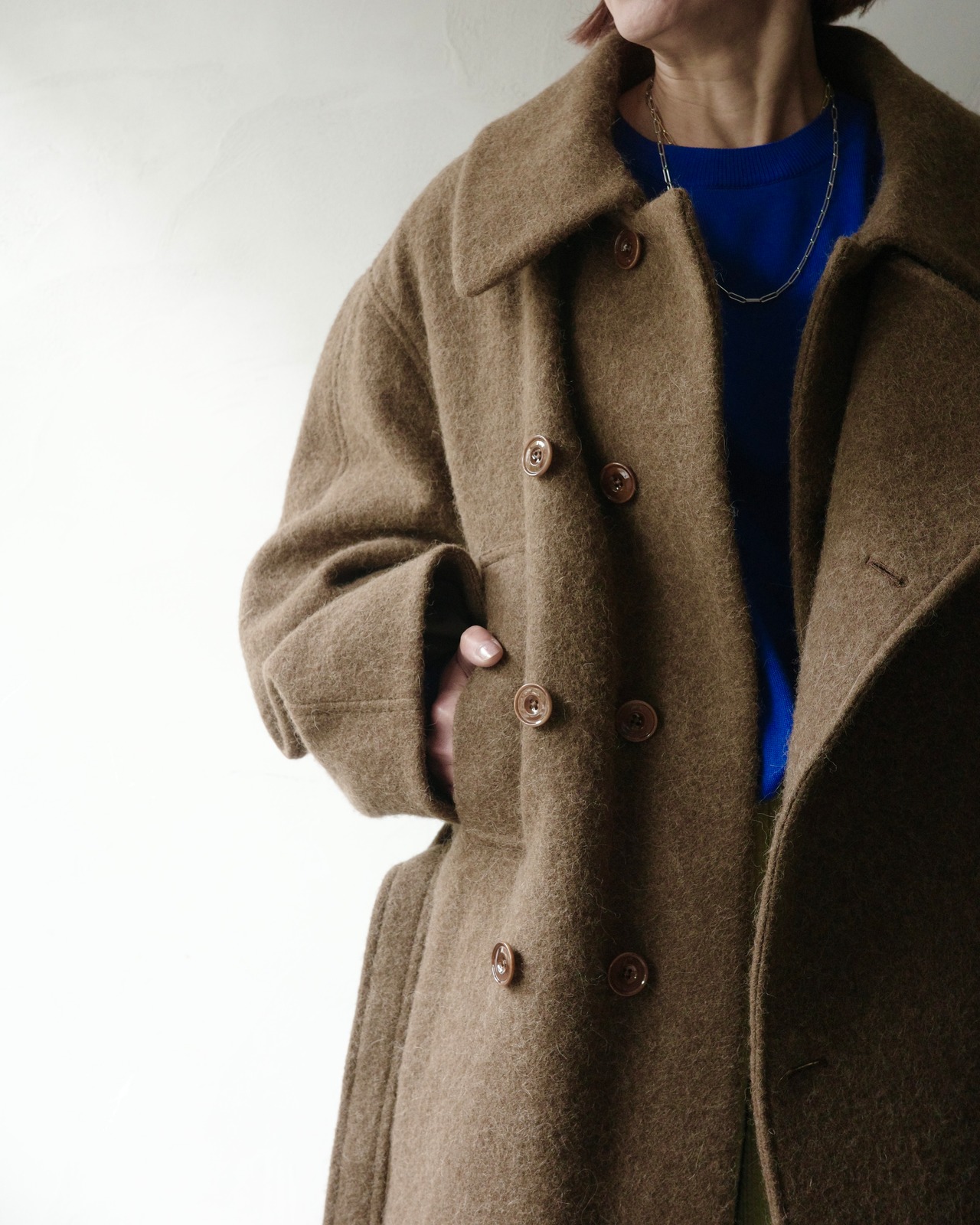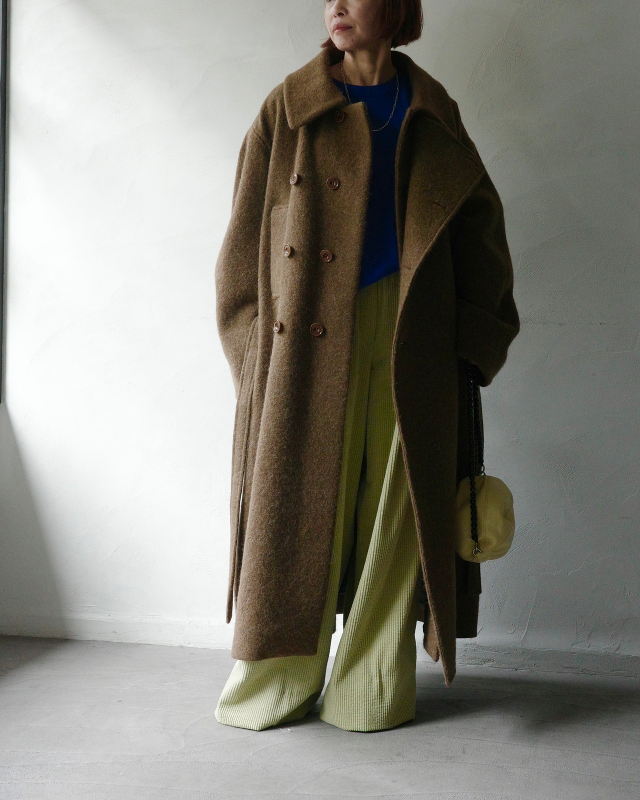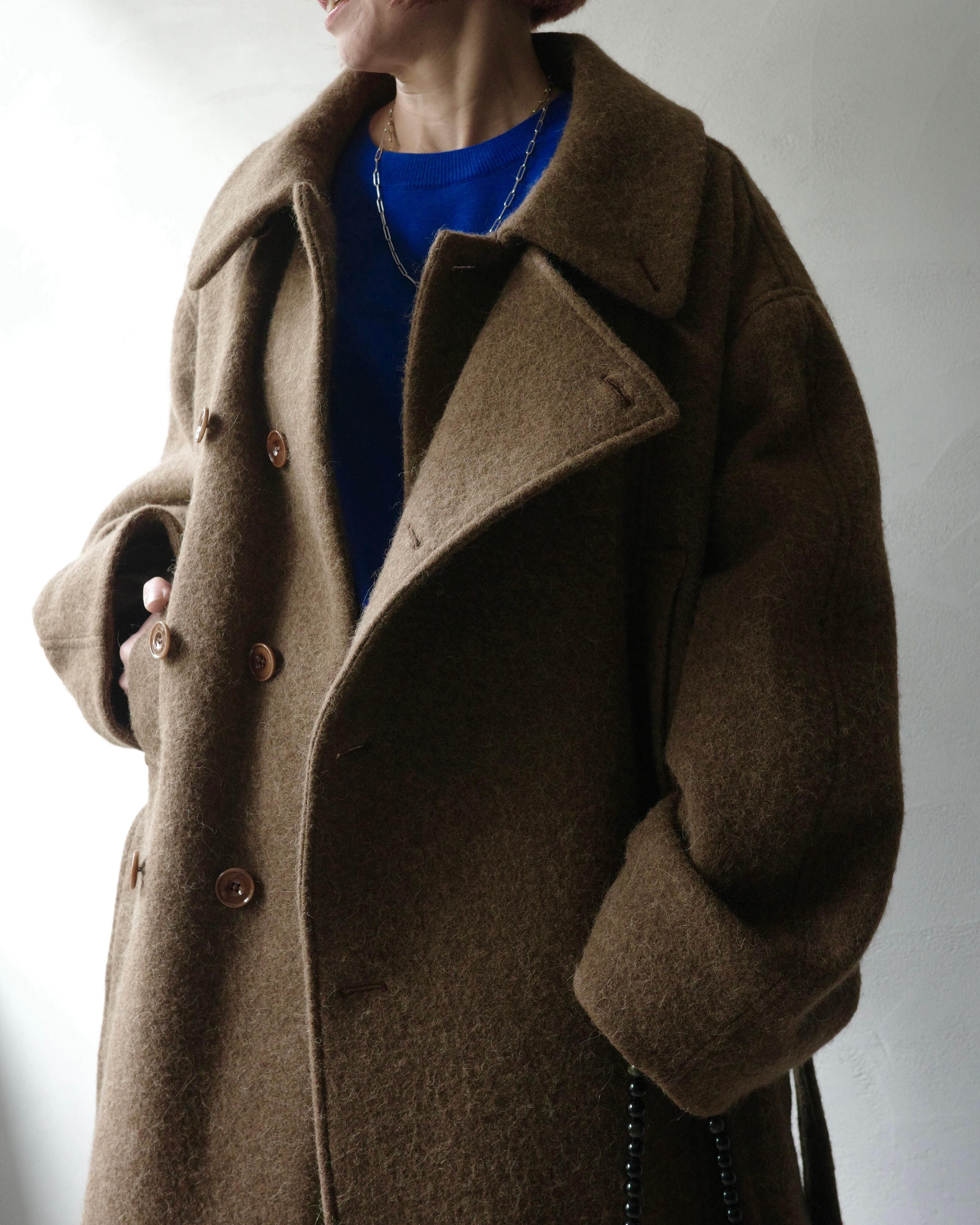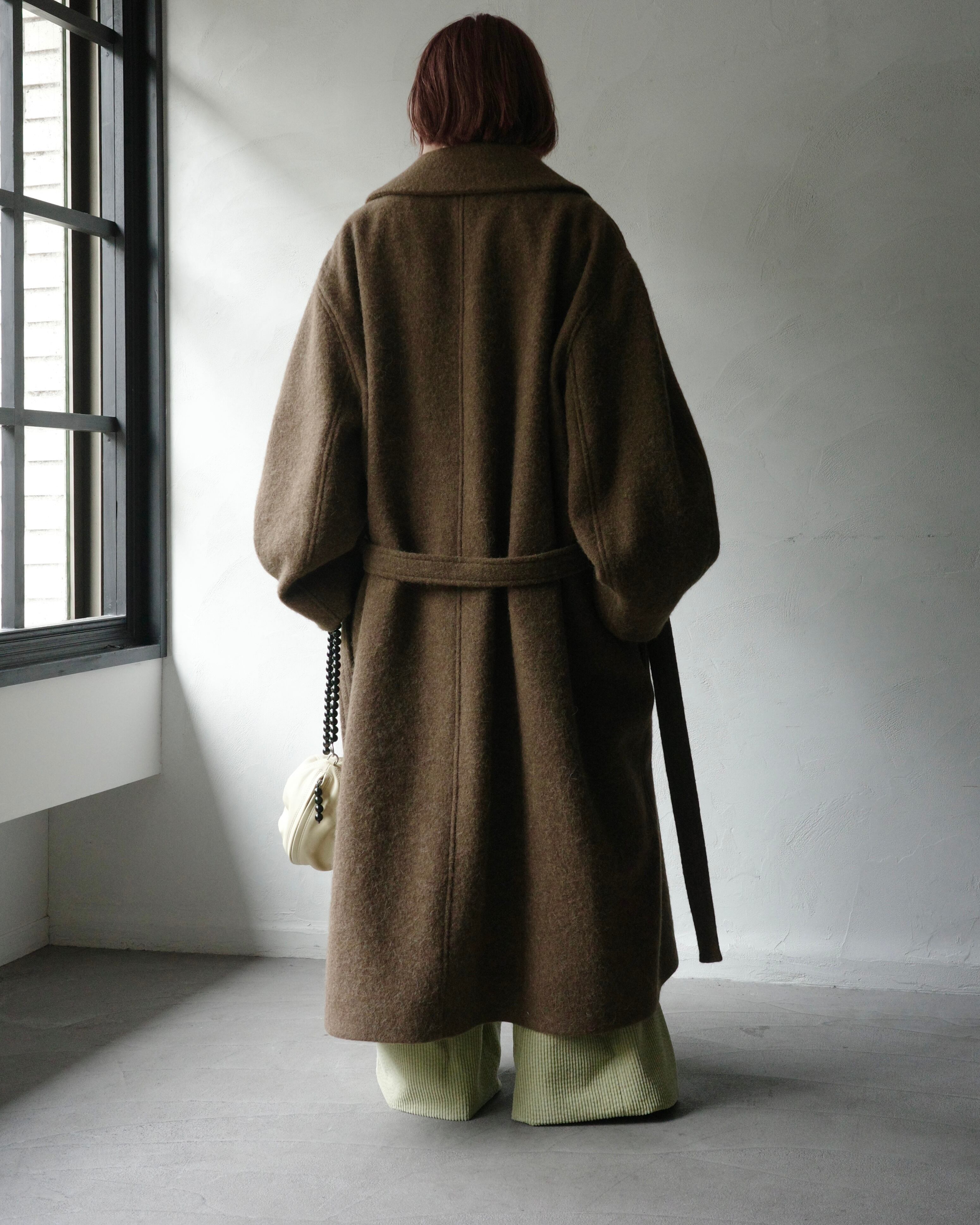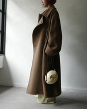 このオーバーサイズのコートは、包み込むようなローブの流れるようなシルエットからインスピレーションを得ています。ウールとアルパカを贅沢にブレンドした素材を使用しており、とても柔らかな手触りと暖かな感触を与えてくれます。コートは自然な腰の位置にバックルのないベルトでウエストで結びます。これは LEMAIRE の特徴的なディテールです。ダブルブレストの開閉部が特徴で、1 組のボタンがバストの中央に、もう 1 組が右側にあり、コンバーチブルカラーはボタンを留めても、開けて着用することもできます。総裏地付きのこのアイテムは、両側に 2 つのローシーム ポケットと、フロントのベルトの上に 2 つの大きなトレンチ ポケットを備えており、スタイルの多様性を提供します。
