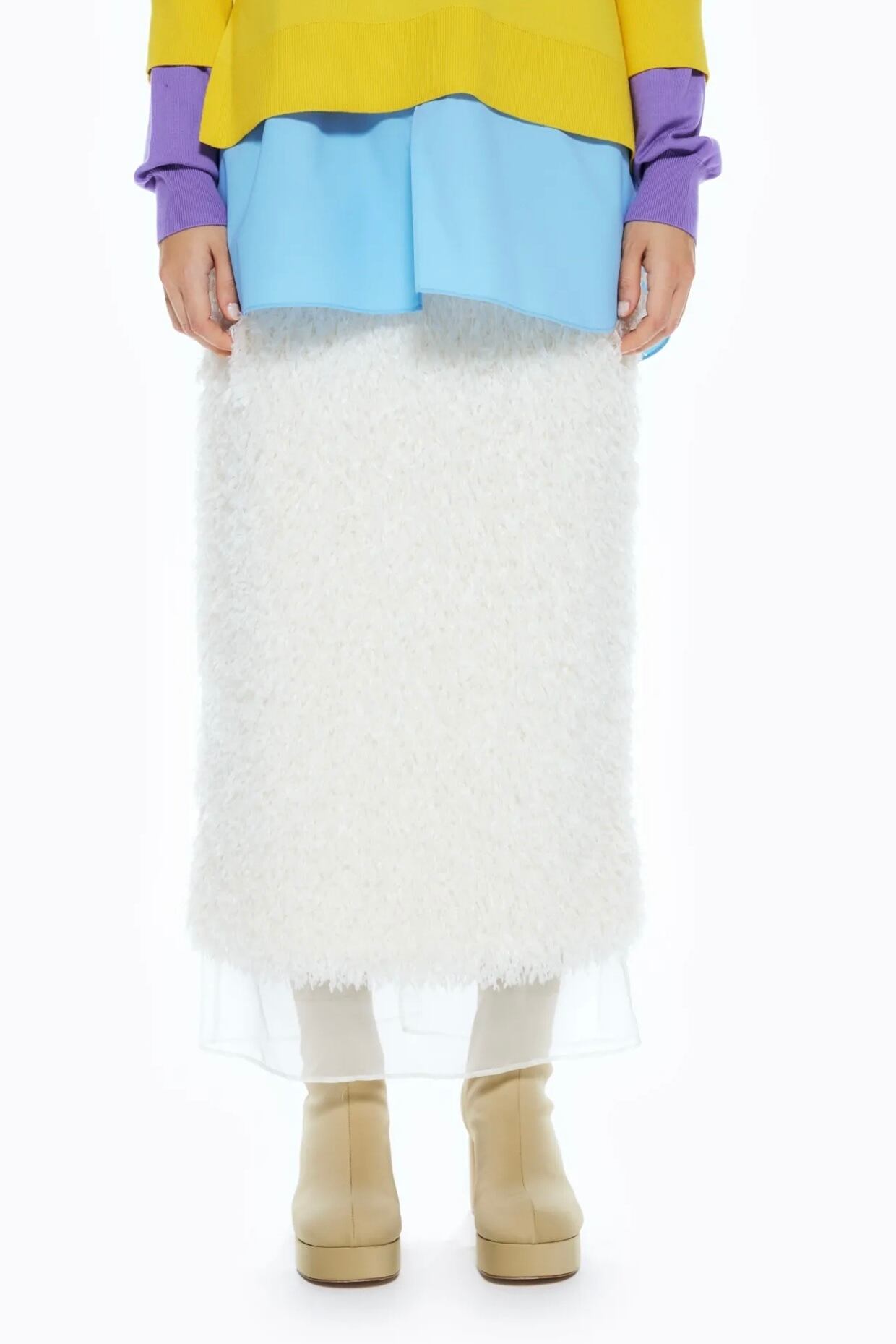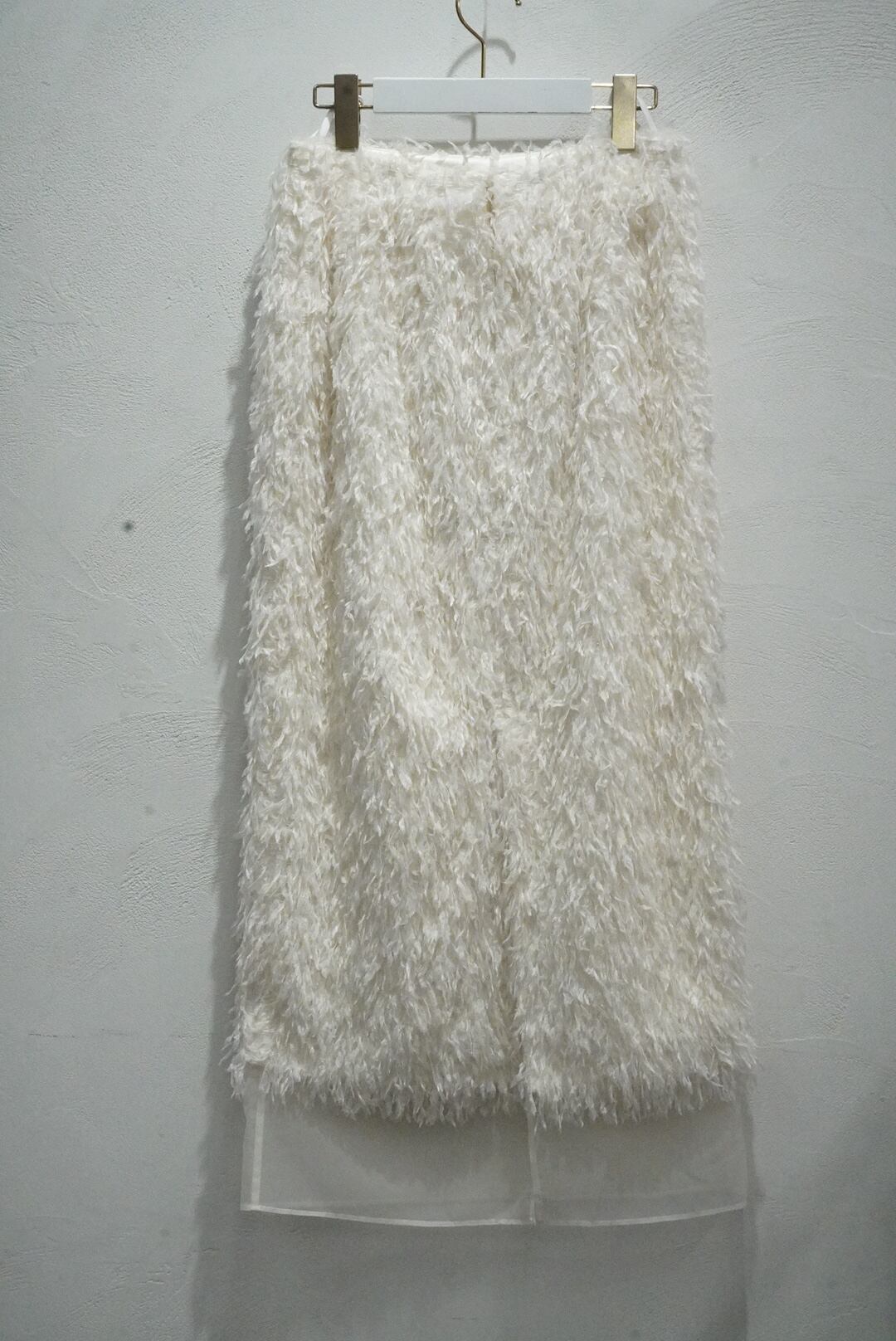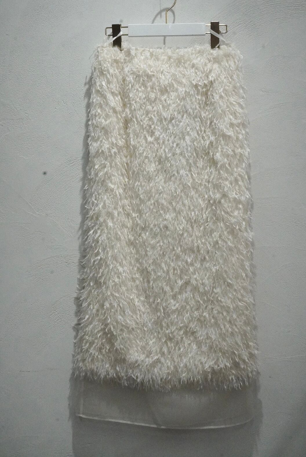 インパクトのあるフェザーニットを使ったペンシルスカート。