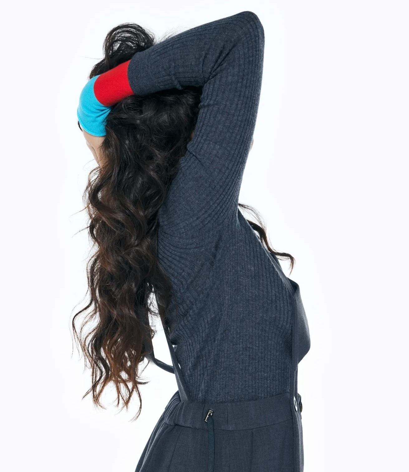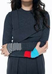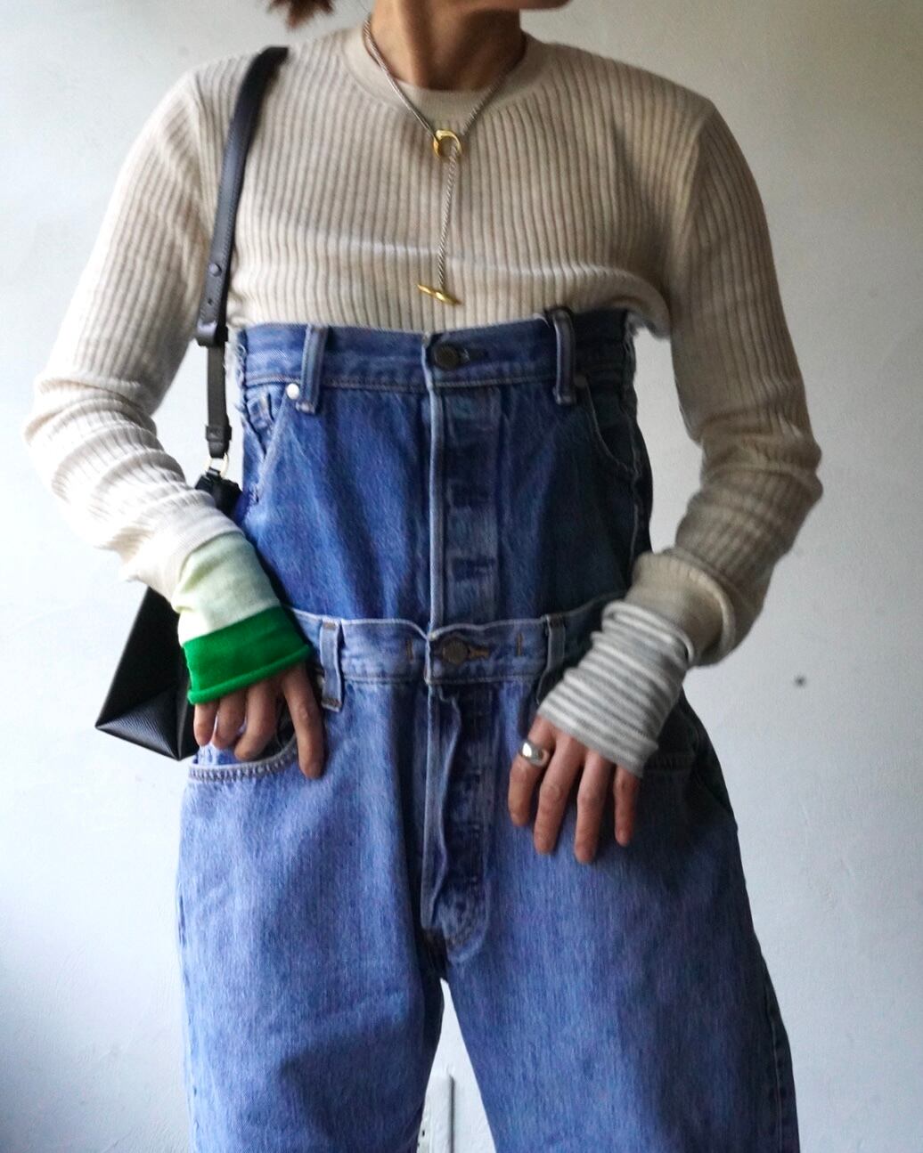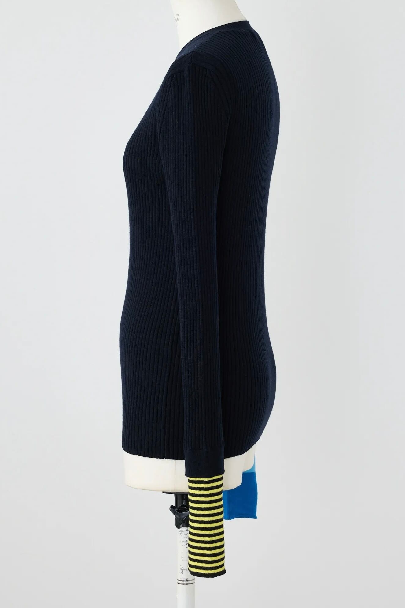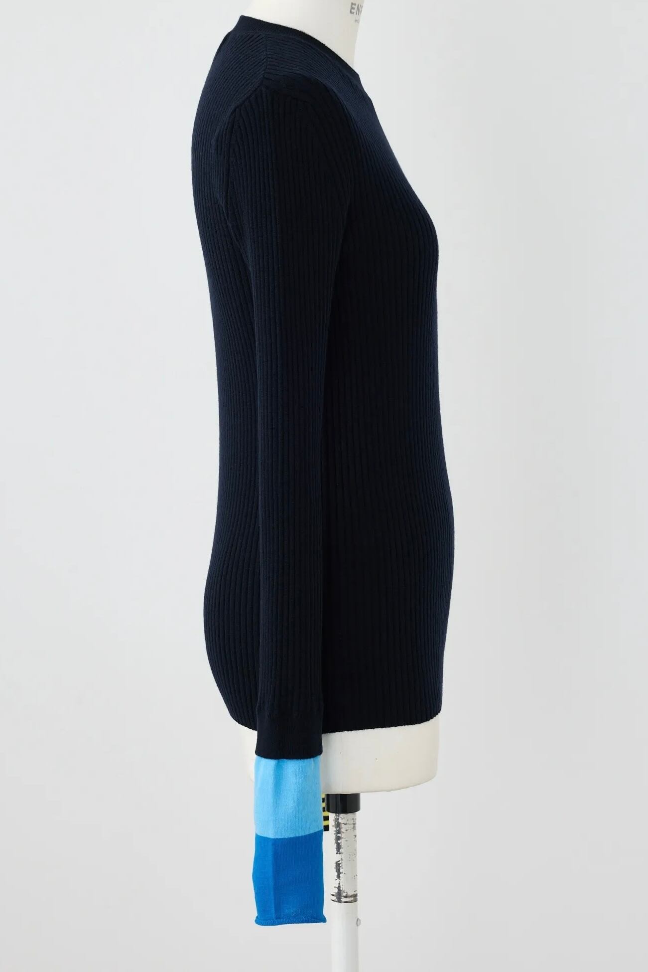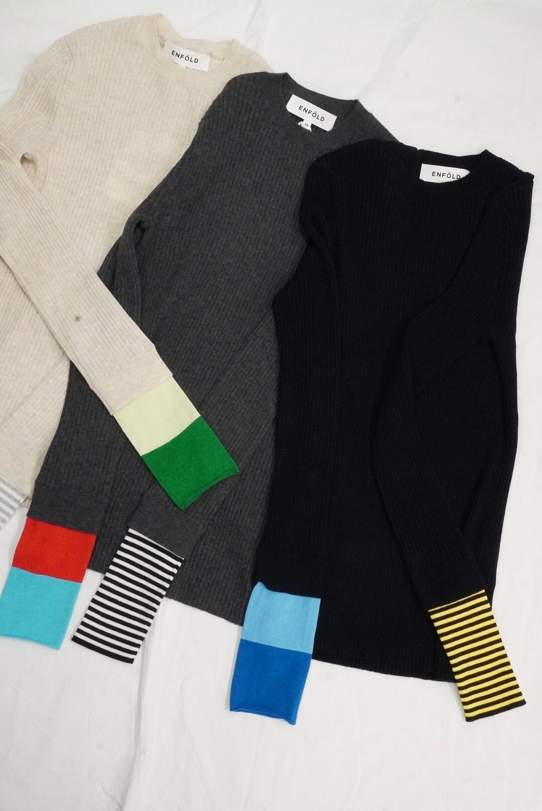右袖口にバイカラートップス、左袖口にボーダートップスをレイヤードしているかのようなデザインで、ENFÖLDらしい楽しいカラーリングがポイントです。