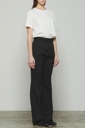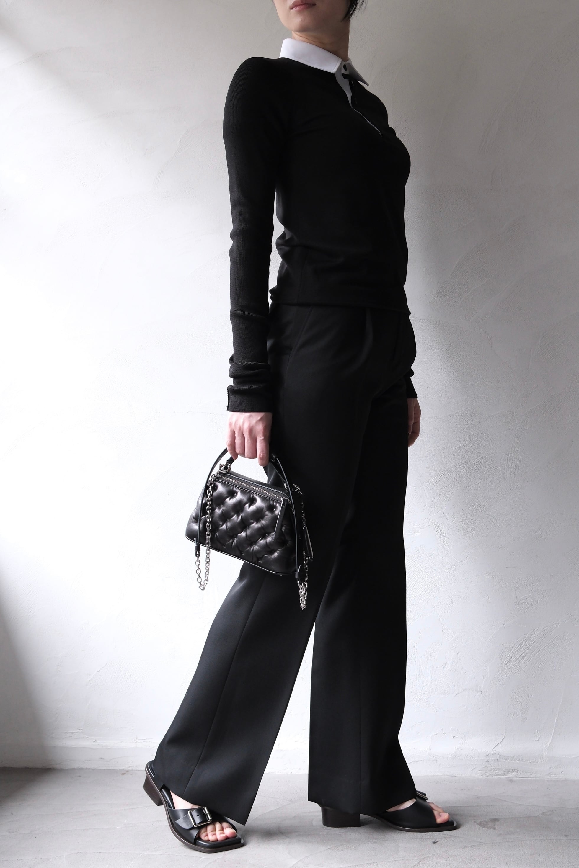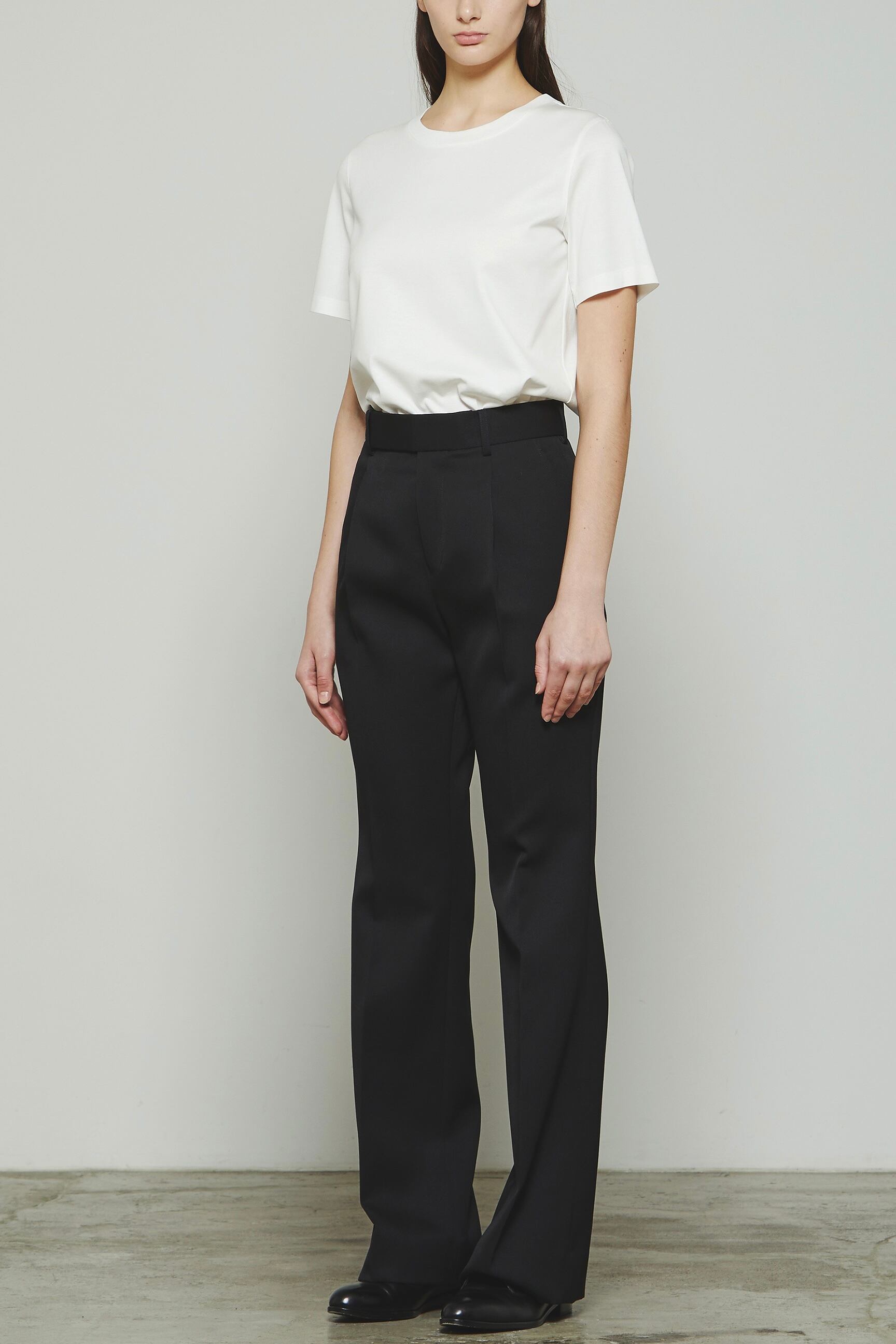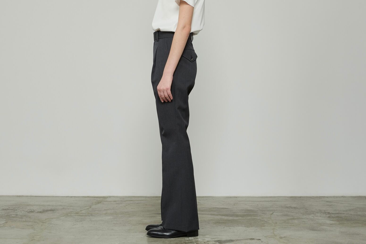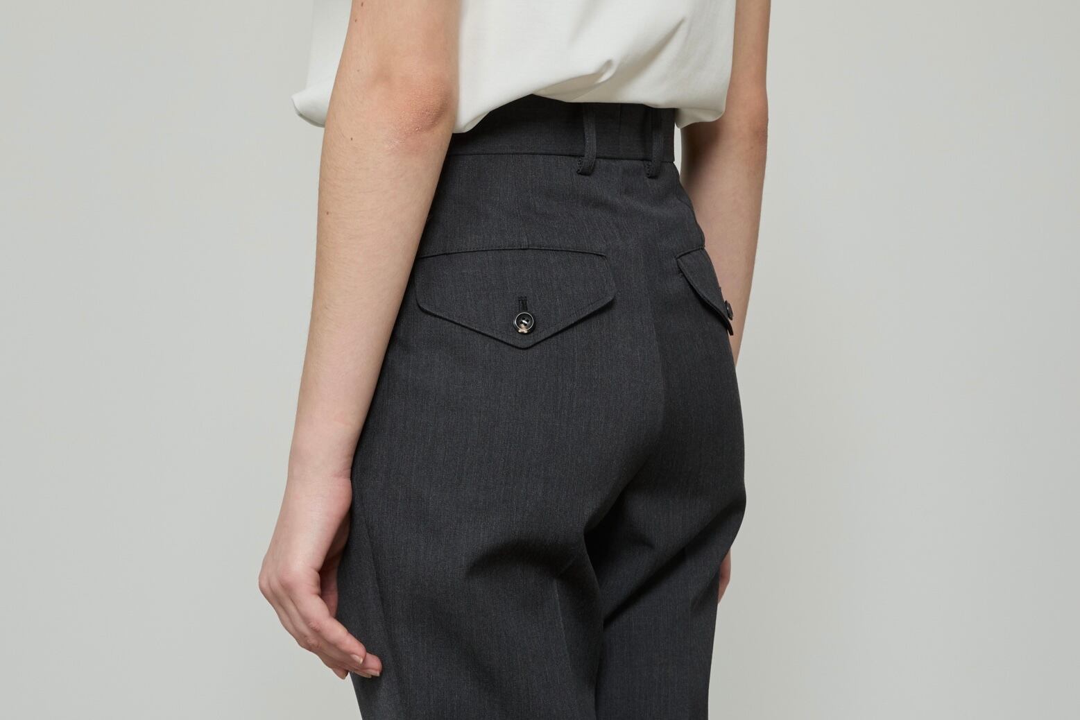 メリノウールのギャバジン素材を使用したフレアースラックスです。腰回りから膝まで程良いフィット感があり、裾に向かってなだらかに広がるフレアーシルエットが特徴的です。ウエストはベルトループ仕様で腰回りが安定した構築的な設計にし、フロント部分はタック無しですっきりとさせ、より洗練されたフォーマルな印象にしながら、履き心地の良さも実現しています。ポケット口と後ろのフラップはハンドステッチのミシンを使うことで、よりトラディショナルな仕様にしています。オリジナルの水牛釦は一般的な物よりも厚みがある希少な水牛を使用した立体的な形状となっております。素材のハリ感とパターン設計が見事にマッチしたシルエット。THE RERACSらしい細かなこだわりを感じられるスラックスです。